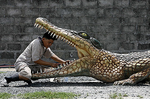 菲律賓馬尼拉,正在為鱷魚刷牙的工人