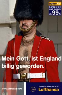 德國漢莎航空公司:幽默的表達了去英國票價便宜的主題。