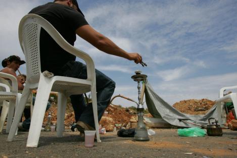 真主黨的影響并沒有消失.他們的支持者們阻斷了通往機場的道路.這些人正在抽水煙打發時間