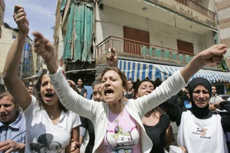 人們對黎巴嫩真主黨極其領袖Scheich Hassan Nasrallah發出憤怒的喊聲