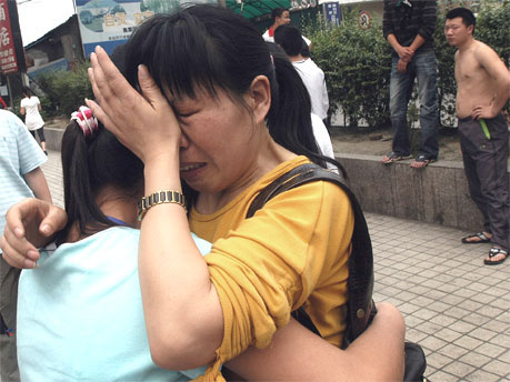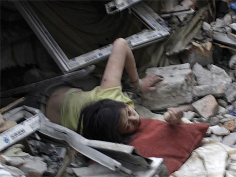 都江堰,倒塌校舍的廢墟中,生還的學生在等待救援。