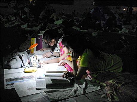 深夜,露宿接頭的學生仍然在挑燈夜讀。身處災難中的她們讓人由衷的敬佩。
