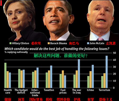 4月16號,希拉里和奧巴馬在費城又有一次大型電視辯論,誰是更合適打敗麥凱恩的人?在這場肉搏戰里,根據有關調查,麥凱恩在法律、稅收和外貿上的得分較高,希拉里在預算和醫療健康上略勝一籌,而奧巴馬則在絕大多數問題上屈居第二,只在燃料價格問題上領先而已。