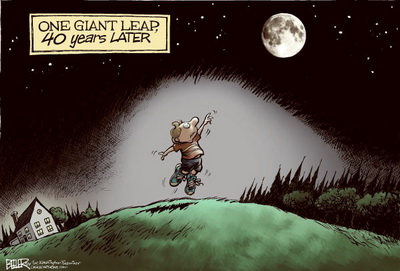 人類登陸月球二十周年、三十周年,美國都沒有如此隆重慶祝。在那些年代,美國的太空計劃再沒有如登陸月球般振奮人心的突破,阿波羅登月計劃也在一九七二年告終,太空總署一直受經費不足問題困擾。太空旅程的科研成果,不再引起百姓關心,最吸引普羅大眾興趣的是太空平民旅游等噱頭。美國政府不惜耗用龐大資源力追,阿波羅十一號登月之旅孤注一擲扭轉局面,奠定美國領先優勢。阿姆斯特朗和艾德林漫步月球兩小時后,竟發現登月艙引擎開關損毀,人急智生用原子筆化解危機,回程燃料也幾乎耗盡,當時總統尼克松就萬一航天員葬身月球的“后備演辭”險派用場,顯示當年太空總署為了“趕工”超越蘇聯,甘冒重大風險。大家對月球重新產生興趣,美國太空總署今次利用高科技修復功能,發表當年登月的“高清”影片,又發表“月球勘測軌道飛行器”攝得的當年登月遺留在月球表面的痕跡,駁斥“捏造登月史實”的陰謀論,喚起老一代國民的記憶,讓新一代分享,燃起大眾對太空探索的興趣和熱情。遙控機械人可以取代人類在月球進行多方面的工作,美國如果重新派人上月球,并非只為重復四十年前做過的事,而是利用這個平臺向人類登陸火星進發。