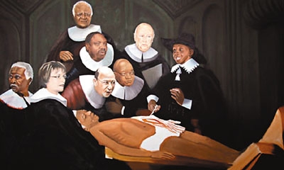 《解剖曼德拉》是達馬素仿照17世紀著名畫家林布蘭的《杜爾博士的解剖學課》而作。該油畫展示出曼德拉死后赤裸的躺在解剖臺上,僅以白布遮蓋下體,被南非前大主教圖圖和南非前總統姆貝基等一群政治人物圍觀。