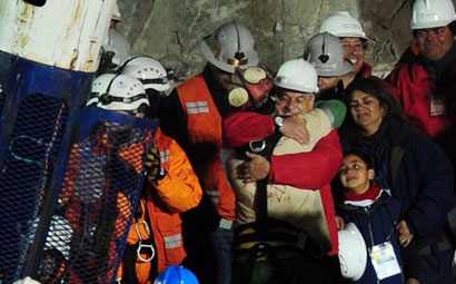 智利圣何塞銅礦8月5日發生礦難,33名礦工在井下約700米處被困超過2個月。經過設計方案、挖掘隧道等一系列準備工作,最后階段的救援于當地時間12日晚展開。智利總統以及多名智利官員到場迎接礦工出井。
