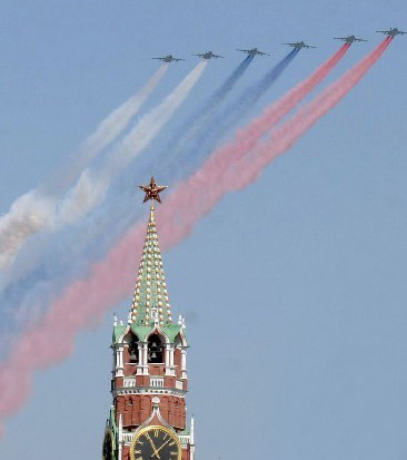 圖為6架蘇-25強擊機在紅場上空噴出象征俄羅斯國旗白、藍、紅三色的煙霧