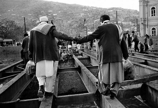 喀布爾居民走過一座尚未完工的橋梁?;A設施建設也許是最為有效的外來援助,它可以真正的改變阿富汗人的生活。