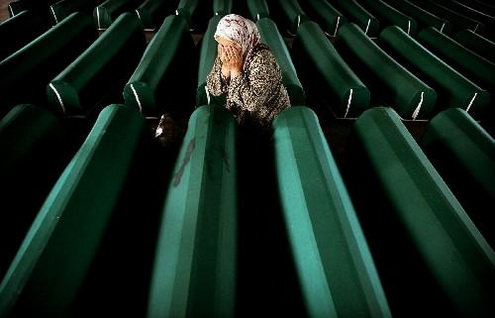 波黑戰爭死難者的親屬正在棺木旁哭泣