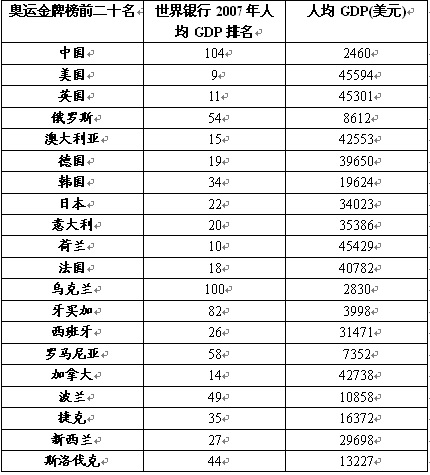 繼續研究世界銀行公布的2007年全球人均GDP排名,還可以發現不僅是美國、英國,在前二十的國家里面,還有澳大利亞、德國、意大利、荷蘭、法國這五個國家也同樣出現在此次北京奧運金牌榜的前二十名的榜單中。雖然說GDP不決定一切問題,但這些國家在提高人民運動水平上的投入,看來是真管用了。