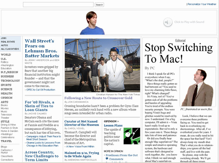 網絡版專稿 記者 焦建 10日,《紐約時報》和《時代》的網站上放了同樣的一組蘋果mac廣告。蘋果頗具霸氣的這樣寫作廣告語:“為什么你的下一臺電腦是MAC?”