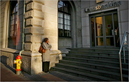 一位婦女正等在等待Landsbankinn銀行的開門營業。為了避免可能出現的金融崩潰,冰島政府在周二接管了該銀行。該銀行是冰島第二大銀行。