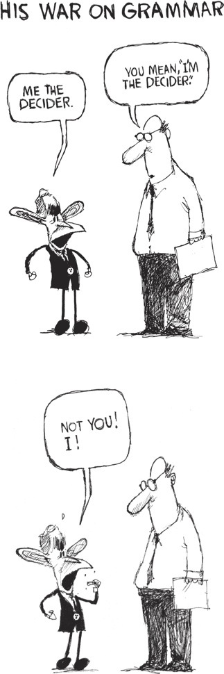 上面那組漫畫有個挺溫馨的名字——《我將懷念的布什的點點滴滴》(What I’ll Miss About George W.),即將在11月3號的《紐約客》雜志上刊登。第二天,美國人民將投票選出他們的新總統,可能就是因為布什,讓闊別白宮八年的自由黨人重新執政。而布什已經不受人待見到這種地步——連他的共和黨同伴麥凱恩都不得不說——我可不是布什,別把我們相提并論。這說法,有點像中國的——你才是XX呢,你們全家都是XX。