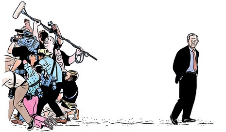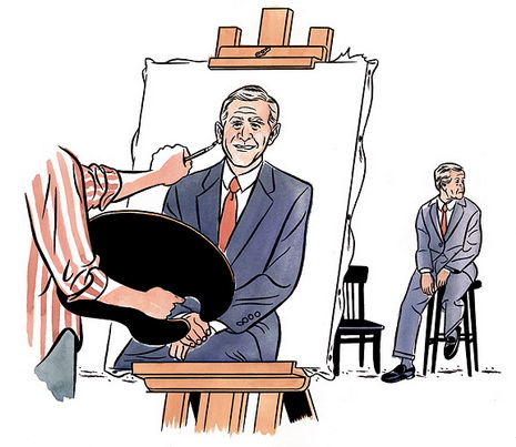 雖然在美國,通過媒體諷刺總統的做法由來已久,剛剛建國時候的美國領導人杰斐遜就曾經說過,“假如在一個報紙自由到混亂不堪的政府和一個完全沒有異見聲音的政府之間做個選擇的話,我寧愿選前者”,杰斐遜可是吃報紙造謠大虧的,所以人家說這話可不是站著說話不腰疼。多少年沿襲下來,媒體對政府和總統的不當行為持不同異見是很稀松平常的事情??刹际部偨y的任上也的確多災多難。我們難以評判這種種決定哪些正確哪些錯誤,但他的政策的確為人詬病的不少。所以,就在8月底,《紐約時報》就已經在周末版的雜志中迫不及待的做著這個選題了——“布什的最后時光”。