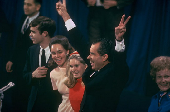 共和黨候選人尼克松戰勝對手漢弗萊之后,與兩個女兒一起慶祝勝利。