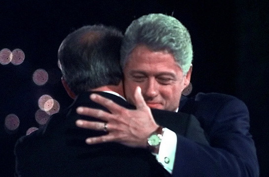 克林頓和戈爾擁抱在一起。