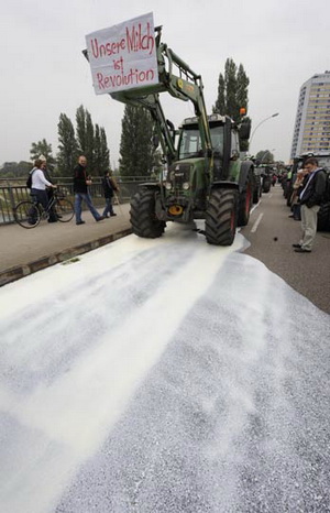在9月19日的一次抗議活動中,奶農們除了將牛奶倒入萊茵河之外,還開著100輛拖拉機從斯特拉斯堡到凱爾,將25萬到30萬升的鮮牛奶倒入田地里。