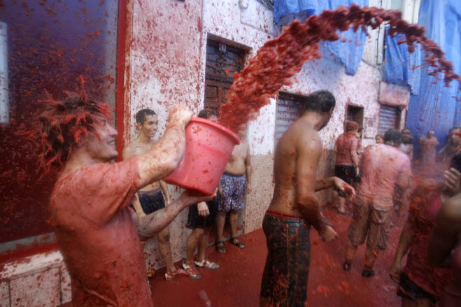 在西班牙地中海小鎮布諾,一名男子在一年一度的西紅柿大戰中向身邊的人潑 西紅柿漿。