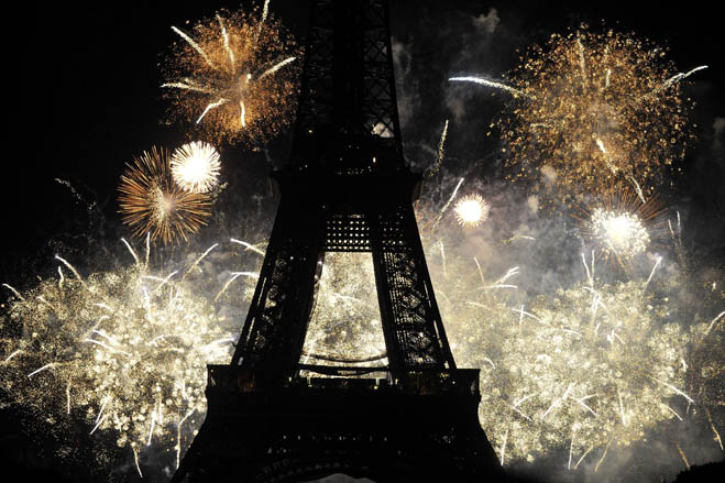 法國國慶日上,煙花照亮了埃菲爾鐵塔上方的夜空。