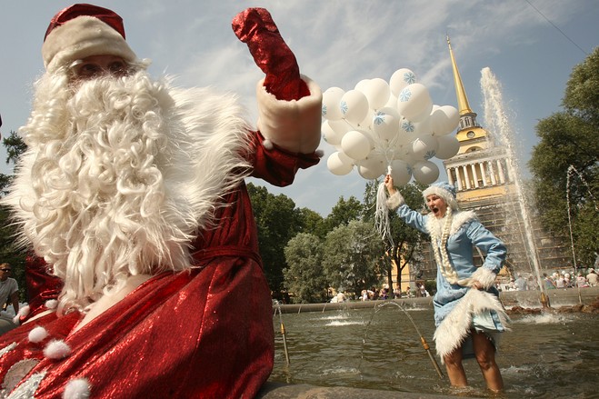一對俄羅斯夫婦裝扮成圣誕老人和白雪公主站在俄羅斯圣彼得堡中心地區的一座噴泉池里。這對夫婦希望人們忘卻夏季的高溫,并提醒他們冬天就要來了。