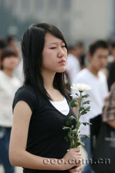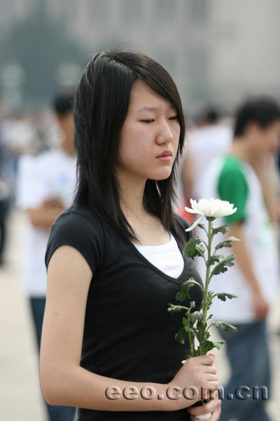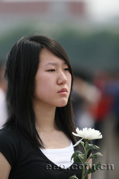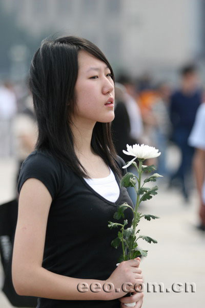 這也許是今天天安門上最美的畫面了,年輕的女孩手持鮮花向在5.12地震中遇難的同胞表達自己的哀思.拍攝者姜楠