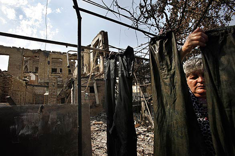 一個茨欣瓦利婦女正在晾曬她剛洗的衣服。她身后是一些在1993年南奧塞梯和格魯吉亞交火中毀掉的建筑