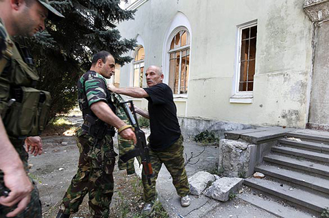 一個南奧塞梯士兵和一個男人在茨欣瓦利的一個集合中發生沖突。