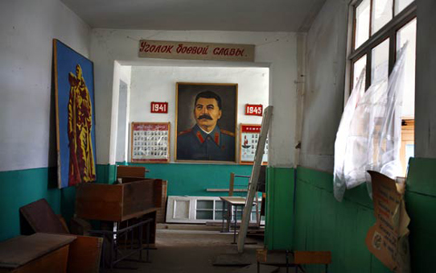 一個被毀掉的學校里,懸掛著斯大林的畫像。
