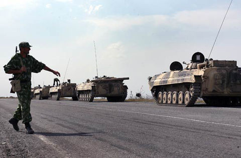 俄羅斯坦克和裝甲車停放在哥里的高速路上。
