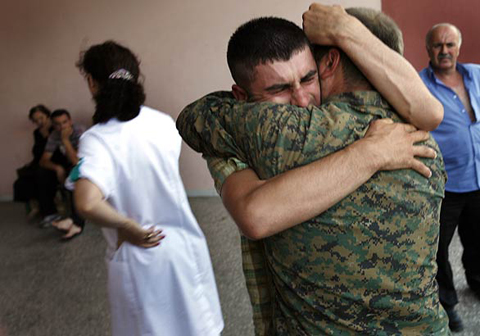 13個格魯吉亞戰俘和2個平民在和5個俄羅斯戰俘進行交換后擁抱在一起。