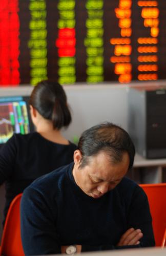 圖片說明:2008年10月16日,鄭州一證券交易所里,面對不斷下跌的綠色大盤,股民們顯得很沮喪。