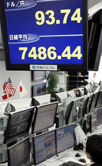 當天上午,東京外匯市場日元對美元和歐元匯率繼續迅速上升,對股市造成巨大壓力。