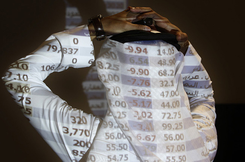 沙特商人在股市大屏幕前,投影在它身上的數字是一片紅色