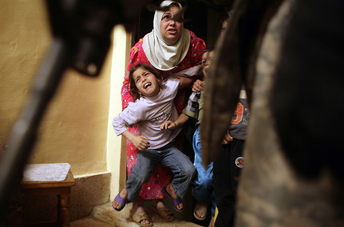 伊拉克巴格達的一個家庭在面對美軍時的恐懼表情
