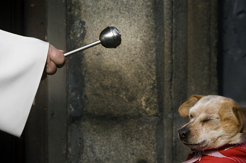 上帝保佑你。在馬德里的祝福狗節日里,神父 Juan Manuel Villar 正給一只虔誠的狗祝福