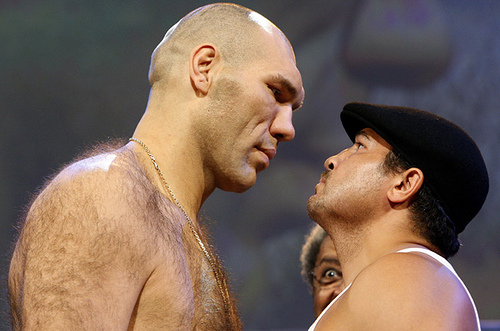德國柏林,WBA 世界錦標賽的俄羅斯拳擊選手 Nikolai Valuev 與美國拳手 John Ruiz 的對峙瞬間