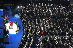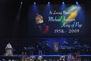 洛杉磯當地時間7月7日周二上午10點鐘(北京時間7月8日周三凌晨1點),流行天王邁克爾-杰克遜的葬禮和公眾悼念儀式在洛杉磯的“森林草坪”公墓舉行。悼念儀式地點則是斯臺普斯中心。