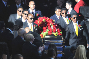 當地時間9時左右,邁克爾·杰克遜布滿紅色鮮花的靈柩從森林草坪墓園被抬上靈車,前往洛杉磯大型體育館斯臺普斯中心準備參加告別式。