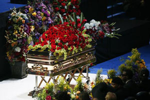 歷時近三小時的告別式尾聲,眾多明星、貴賓以及邁克爾·杰克遜的子女、家人上臺合唱這位男星生前知名歌曲We are the world與Heal the world。