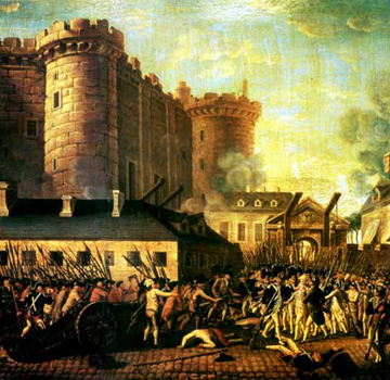 這是一副頻頻出現在歷史課本中的圖畫,圖中表現的是1789年7月14日,巴黎人民攻占了象征封建統治的巴士底獄的場景,在這一天法國人民推翻了君主政權。