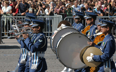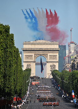 為慶祝國慶節,每年都要在香榭麗舍大街上舉行大規模的閱兵儀式。7月14日上午,大街戒嚴??哲姍C群飛抵凱旋門上空,閱兵開始。編成隊列的飛機掠過香榭麗舍大街,機尾噴出紅、白、藍三色煙幕,宛如一面巨大的法國國旗在空中舒展開來。