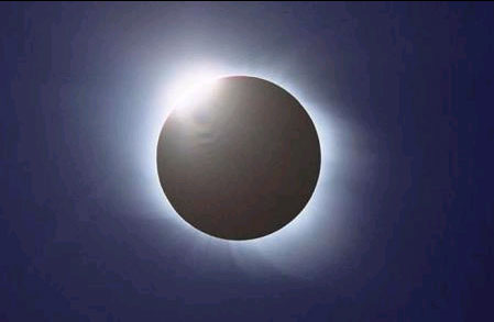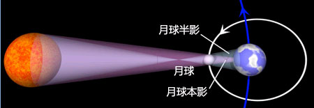 日全食原理:日全食必須太陽、月亮、地球在一條直線的時才能發生。同時,月亮還必須在新生相的位置。在日全食的時候,月亮在地球的影子分為兩部分,中心的地區叫做本影,外面的區域叫做半影。只有處在本影的位置才能看到日全食。