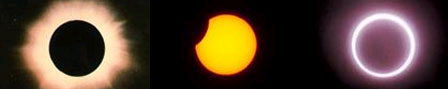 日食類型(從左至右):日全食:觀測者處于本影范圍內,整個太陽將會被遮??;日偏食:觀測者處于半影范圍內,只能看到日輪的一部分缺失;日環食:月球位于公轉軌道中離地球較遠的位置,觀測者看到太陽變成圓環。
