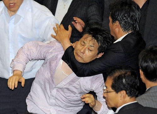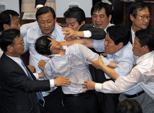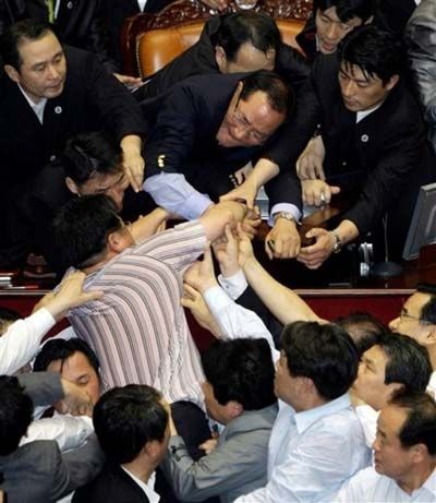 韓國國會上演“全武行”的情景經常會見諸媒體,根據韓國國會事務處的相關統計資料,從2004年至2008年,韓國會議事廳辦公樓內的暴力事件增長了6倍。