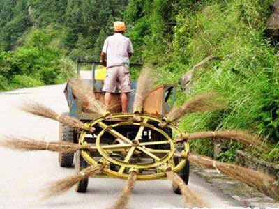 最牛清掃車: 四川達縣養路段碑廟鎮道班工人用自制的清潔車清掃公路。這輛清潔車將10個掃帚捆扎在自制的轉動軸上,再掛在拖拉機尾部,清掃道路既省人工又省時,還逗樂了沿途群眾。