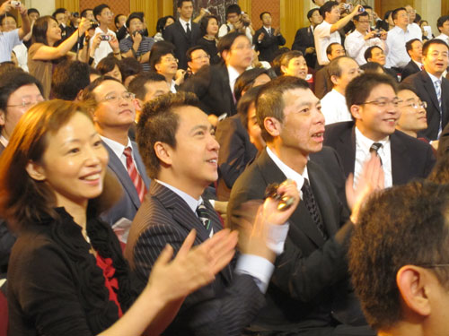 儀式的設置可謂別出心裁,28家上市創業板的公司被分成4批,每批7家。敲鐘的環節由28家上市公司的董事長執行,每當一位董事長敲響鐘聲,其代表的公司的當日開盤價就會在屏幕上顯示。華誼兄弟被安排在第四批。
