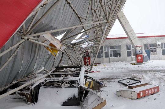 暴雪壓塌邢臺縣南石門鎮西小郭村附近一座大型加油站