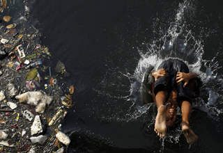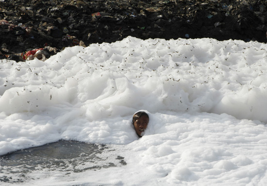 男孩在污水中嬉戲