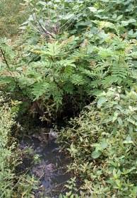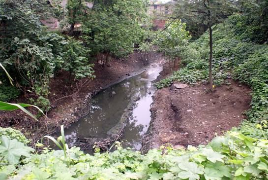 (永安藥業沿河而建,數百米開外的一條溪澗,充滿了污水,黑得發臭。)