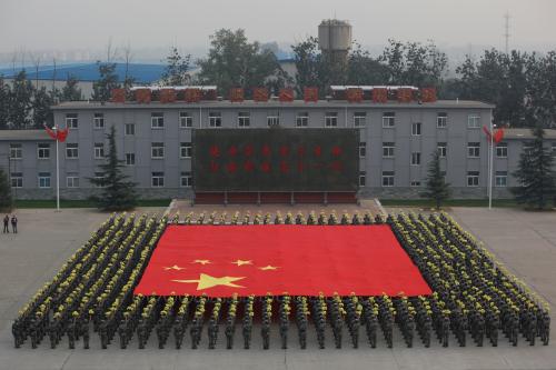 (10月1日,由1949名軍人組成的國旗正步儀仗方陣將作為首個群眾游行方陣,耗時4分16秒通過天安門。2009年9月24日,北京郊區某裝甲師訓練場,戰士們托著一面巨大的國旗進行訓練。)